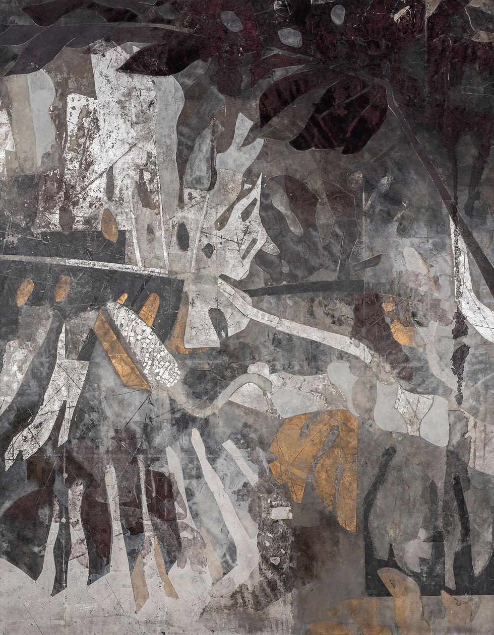 He explores universal forms in familiar nature and expresses them using techniques that take advantage of the characteristics of mineral pigments, such as blotches and pools that occur on the canvas.